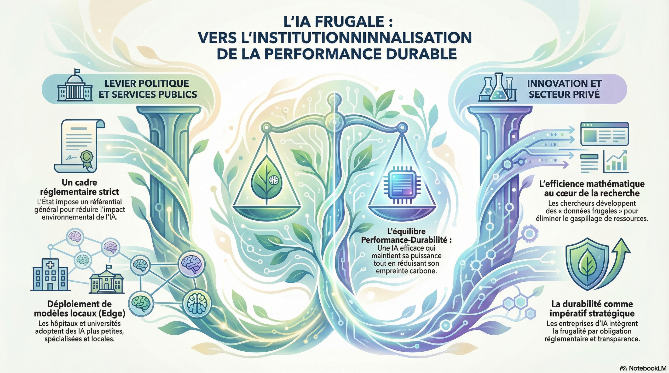 Dans ce scénario, l’IA frugale devient la norme grâce à une forte régulation publique. L’État impose des règles pour réduire l’impact environnemental, et les acteurs publics adoptent des modèles plus sobres et locaux. Les chercheurs et startups développent des solutions efficaces et moins gourmandes en ressources, tandis que les entreprises d’IA intègrent la frugalité comme une obligation. Cela permet de concilier performance et réduction de l’empreinte carbone.