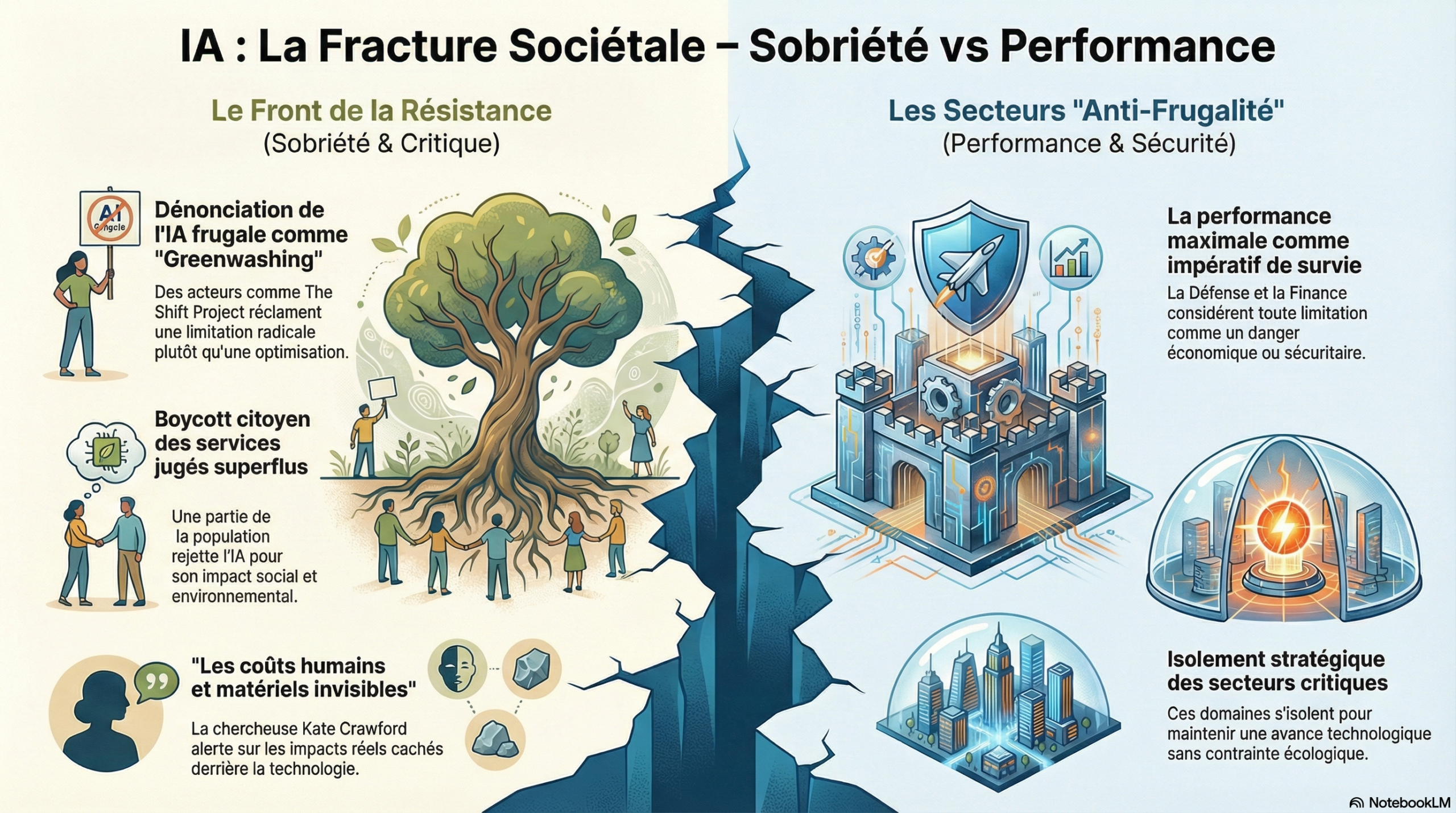 Dans ce scénario, la société se divise autour de l’IA. Certains acteurs et citoyens contestent son développement et prônent des alternatives plus sobres, tandis que d’autres secteurs refusent toute limitation au nom de la performance. Cette opposition crée de fortes tensions politiques et une société fragmentée autour des enjeux technologiques et écologiques.