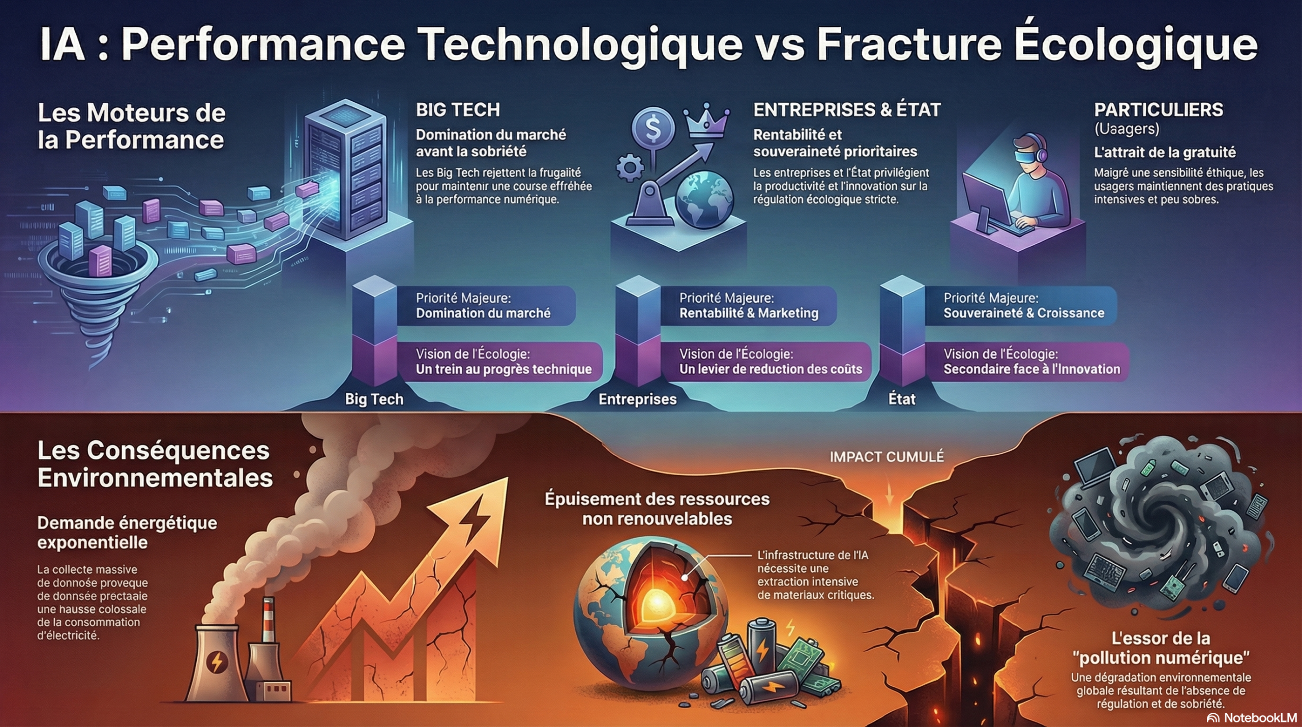 Dans ce scénario, la performance et la croissance priment sur l’écologie. Les entreprises et les particuliers utilisent massivement l’IA sans réelle sobriété, tandis que l’État favorise l’innovation. Cela entraîne une forte hausse de la consommation d’énergie et de la pollution numérique.